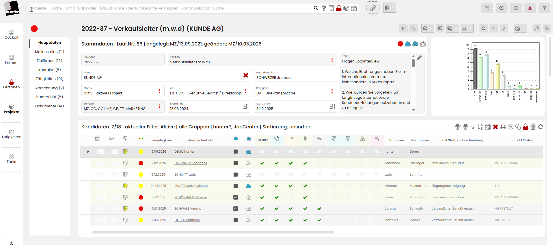 Neben der optischen Modernisierung bietet hunterNEXT spürbare funktionale Verbesserungen im täglichen Arbeiten. Die Bearbeitung von Kontaktdaten, Positionen oder Statusinformationen erfolgt schneller und direkter, viele typische Schritte erfordern weniger Klicks und weniger Suchaufwand. Die Summe dieser kleinen Beschleunigungen sorgt für eine deutlich effizientere Nutzung – besonders in Rollen, in denen dieselben Abläufe dutzende Male am Tag wiederholt werden. Zugleich wurde das User Interface so gestaltet, dass es auch mobil intuitiv bleibt und den flexiblen Arbeitsrhythmen moderner Personalberater gerecht wird.